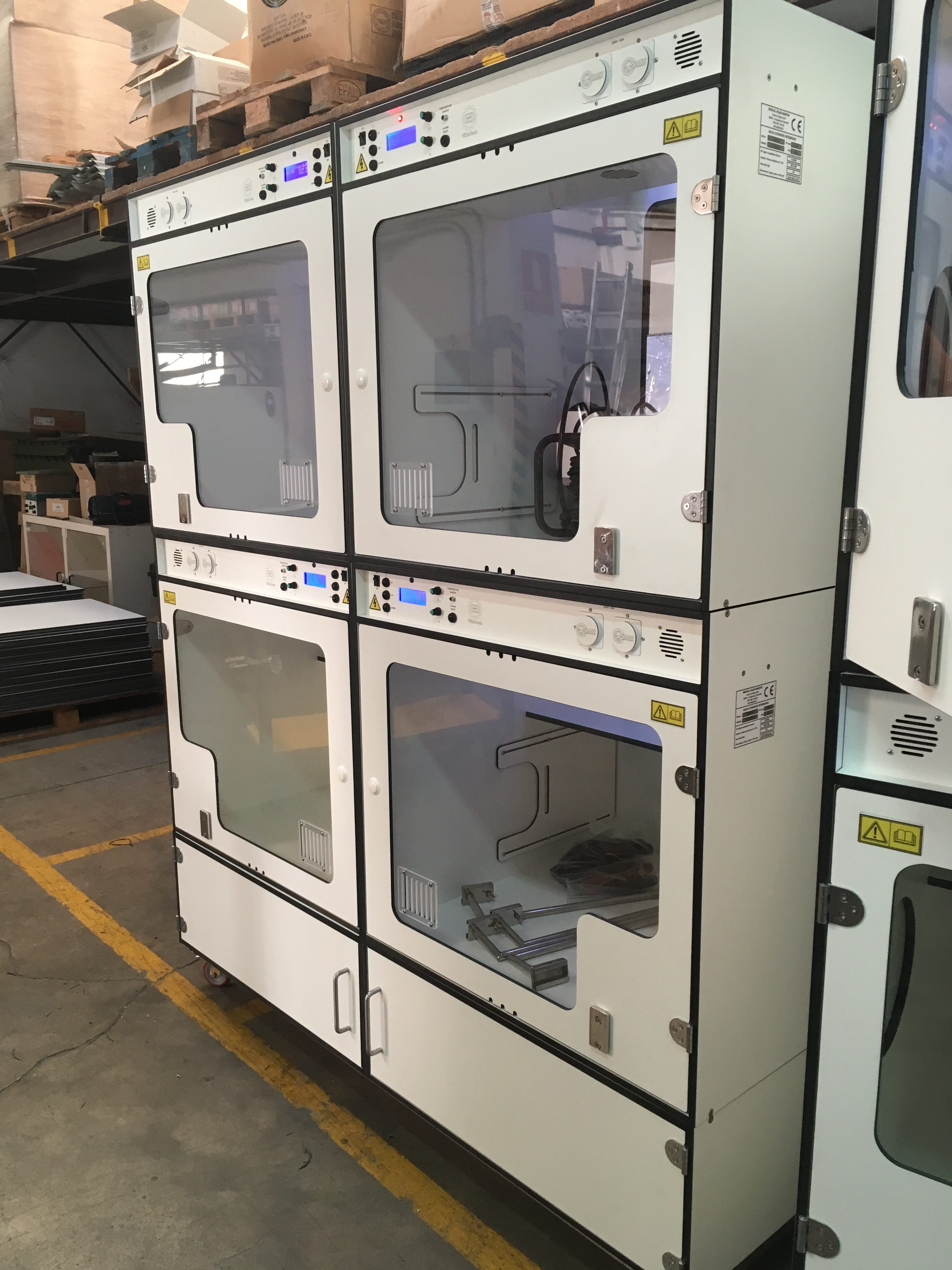 Inicio » JAULAS A MEDIDA » 4 jaulas estándar con modulo de calefacción + muebles separadores con ruedas